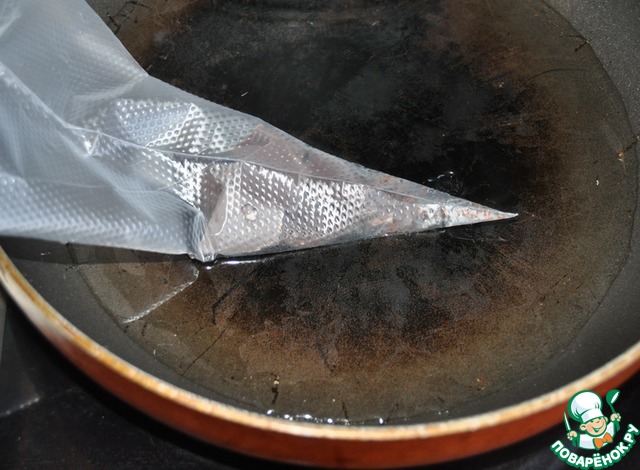 Шоколад ломаем на кусочки, кладём в пакетик. Кладём пакетик с шоколадом в горячую воду на 3-5 минут, пока он не расплавится. -
