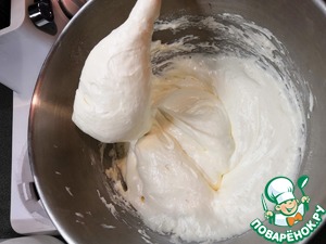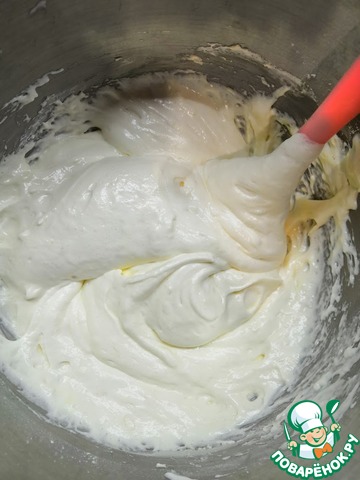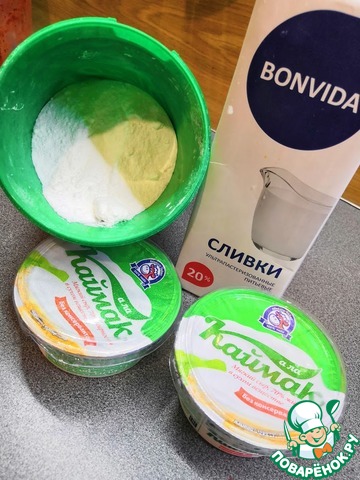 Просто взбиваем все ингредиенты вместе: 300 гр. сливочного сыра, 150 гр. сливок 20% и 150 гр. сахарной пудры. -