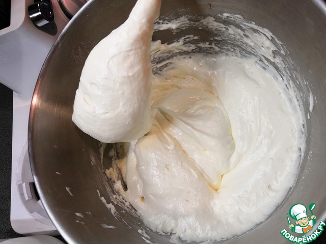 Добавляем 150 гр. муки, перемешиваем снизу вверх.