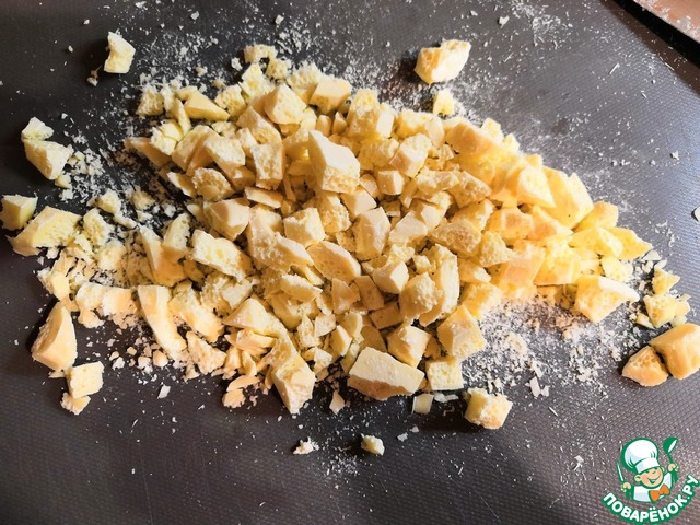 100 гр. белого шоколада, предварительно замороженного, рубим произвольно.