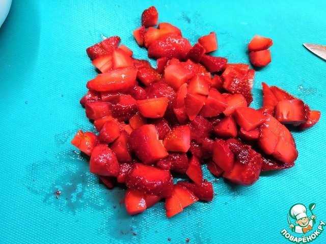 Пока печется бисквит моем и режем 250 гр. клубники. 150 гр. откладываем на украшения и начинку.