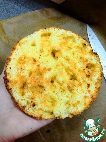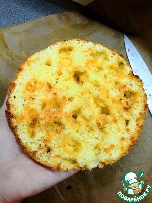 В это время бисквит уже готов, режем на 3 части. Кусочки шоколада растаяли и придали бисквиту карамельный аромат и привкус.