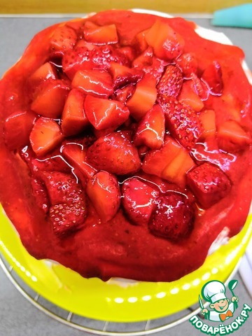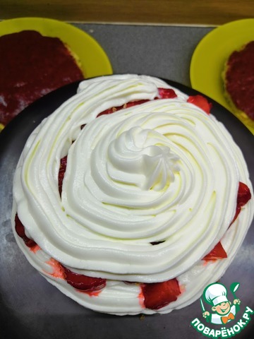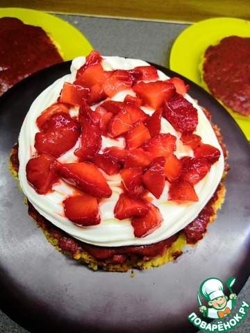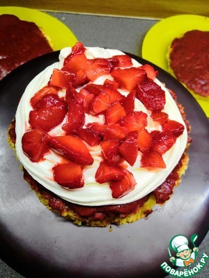 Повторяем.. Крем, клубника, крем и третий бисквит. -