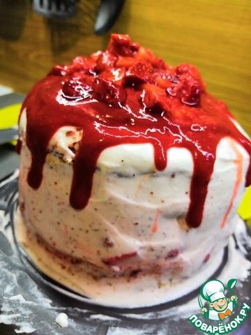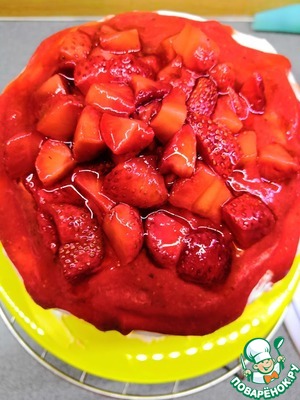 Покрываем весь торт кремом, сверху поливаем остатками джема и выкладываем последнюю клубнику в качестве украшения.