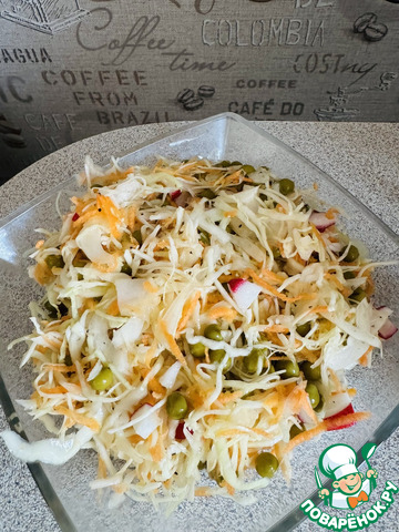 Капусту нашинковать мелко. Добавить горошек, морковь натереть на крупной терке.