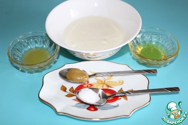 Приготовила салатную заправку, добавив в домашний йогурт (можно воспользоваться любым натуральным без наполнителя) мед, лимонный сок, горчицу и соль (не советую добавлять сразу полную порцию заявленных ингредиентов), хорошенько взбила все вилкой.