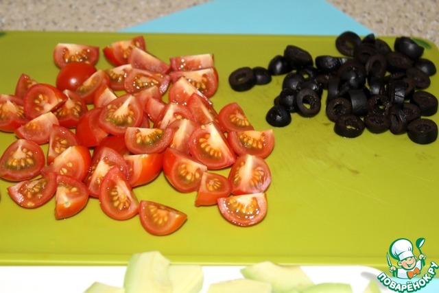 Помидоры нарезала четвертинками, маслины кольцами.