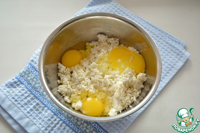 • В миску положите творог, добавьте яйца, соль