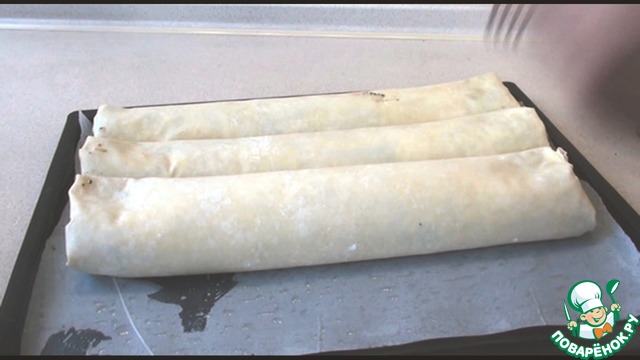 Заворачиваем всё в рулет, стороной, которая пошире, края не обязательно подворачивать, я подвернула, т. к. у меня он не помещался на противень. Противень нужно застелить пергаментной бумагой и смазать маслом. Аналогично заворачиваем еще два штруделя.