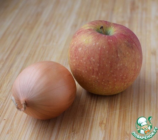 Почистить и нарезать лук и зубчик чеснока. У яблока удалить сердцевину и кожицу, нарезать.