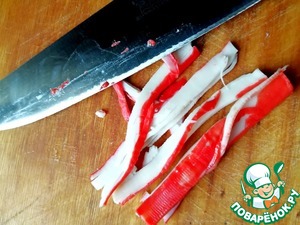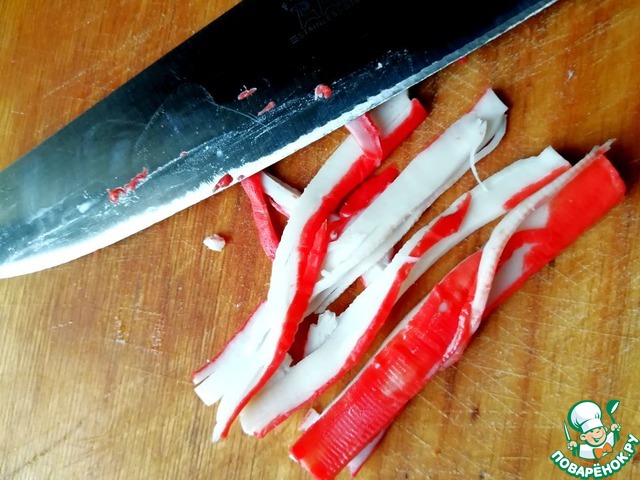 Крабовые палочки максимально тонко и вдоль волокон нарезаем соломкой. Я настаиваю в этом рецепте на аккуратной и тонкой нарезке, именно она придаст воздушность салату