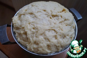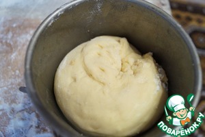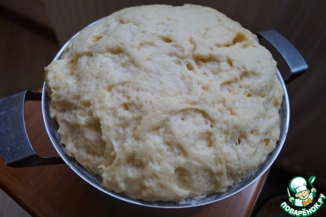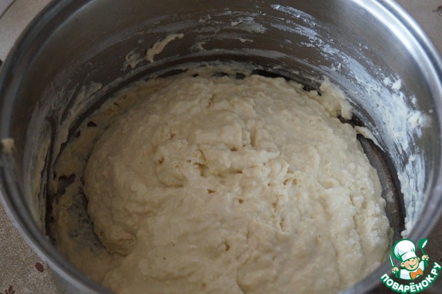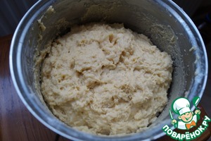 Затем добавляем оставшуюся муку и замешиваем не крутое, липкое тесто. Накрываем его полотенцем и оставляем в теплом месте на час, для подъема.
