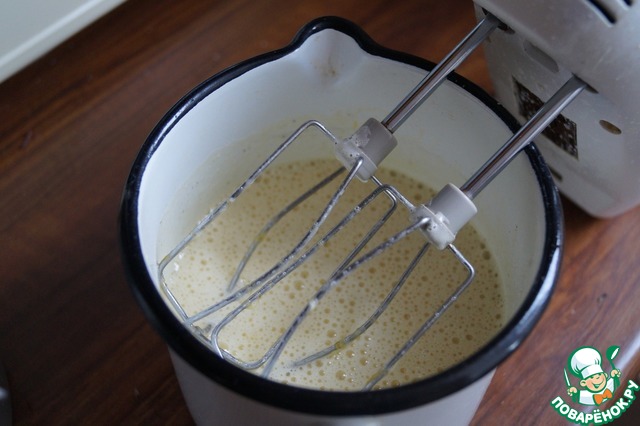 Тем временем взбиваем яйца с сахаром и ванильным сахаром до пышной белой массы. А также растапливаем сливочное масло.