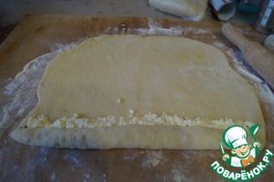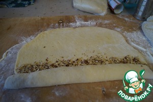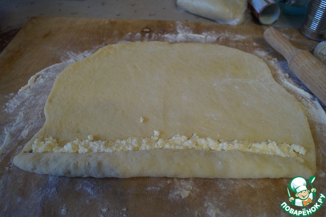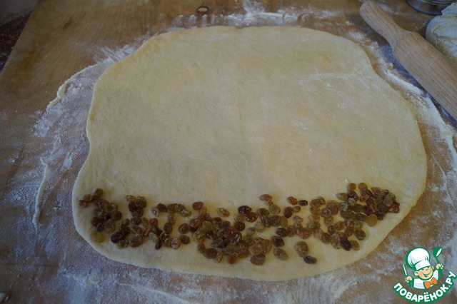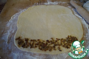 Готовое тесто делим на три части. Первую часть на припылённом мукой столе раскатываем в круглый пласт. На край тесто кладем одну треть изюма.