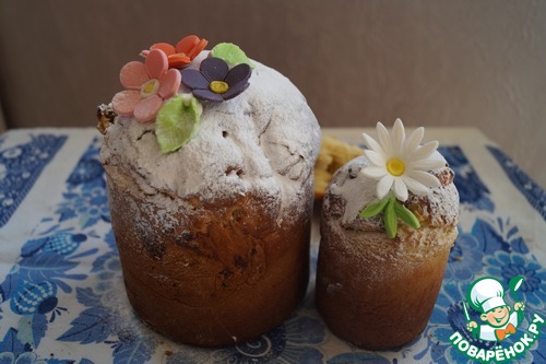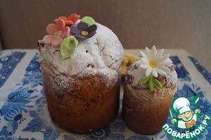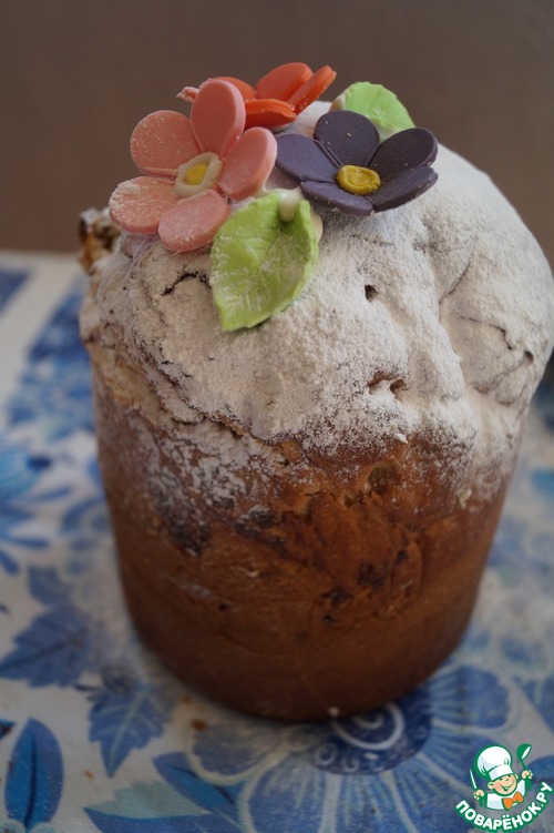 Посыпаем верх куличей сахарной пудрой со вкусом ванили. Я еще украсила цветочками из сахарной мастики, прикрепив их при помощи растопленного белого шоколада.