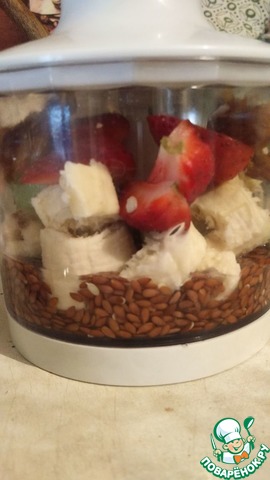 Замоченые с ночи семена льна переложить в блендер. Добавить остальные ингредиенты, оставив немного для украшения.