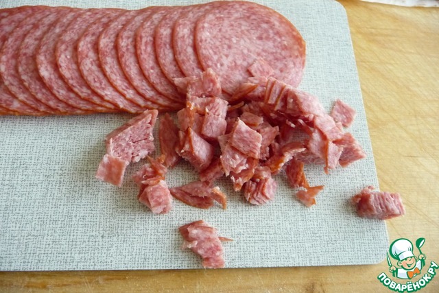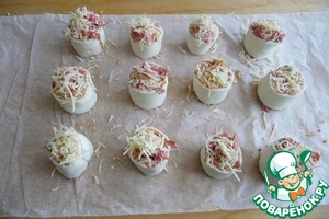 Выложить кусочки салями и натертый сыр. Немного сыра оставить. -