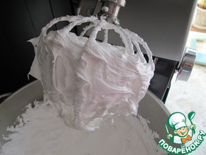 Параллельно с процессом приготовления сиропа начать взбивать белки, которые должны быть комнатной температуры. Добавить к ним щепотку соли. Белки взбивать до мягких пиков (виден след от миксера на поверхности белка) на средних оборотах. На этом этапе вливаем очень тонкой струйкой горячий уваренный сироп, стараясь не попасть на лопасти миксера, чтобы не разбрызгать сироп по стенкам чаши. Готовность сиропа и взбивания белков должны примерно совпасть по времени! Переходим на максимальный режим взбивания примерно в течении 7-10 минут (время зависит от мощности миксера). За время взбивания чаша миксера должна стать теплой, а крем "намотаться" на лопасти миксера. Хорошо взбитый крем на уваренном до нужной консистенции сиропе очень хорошо держит форму, не "плывет" при декорировании выпечки и десертов.
