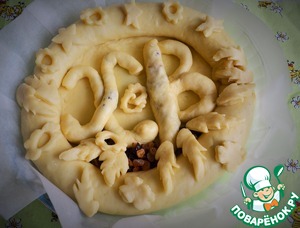 Из остатков теста вырезать мелкие фигурки и украсить. -