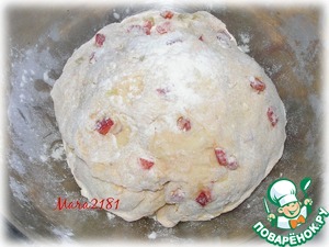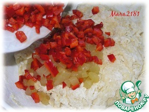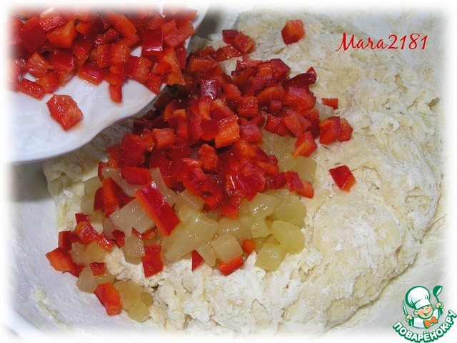 К тесту добавляю нарезанные болгарский перец, маринованный огурец, а также 1 щепотку тимьяна (по вкусу).