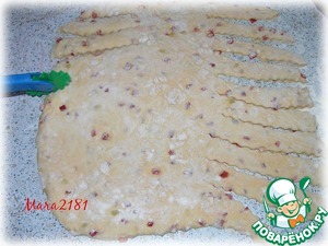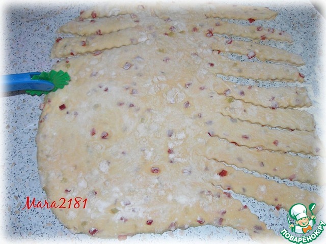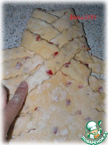 Ещё раз вымешиваю тесто, но совсем чуть-чуть. Раскатываю тесто прямоугольной формой толщиной около 1 см. Теперь с помощью фигурного ножа делаю около 10 разрезов с двух противоположных сторон. Разрез делается, не доходя до середины. -