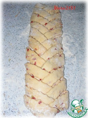 Каждую полосу поочерёдно загибаю к центру, чередуя с левой и с правой стороны. Край каждой полосочки прижимаю аккуратно к основе теста.