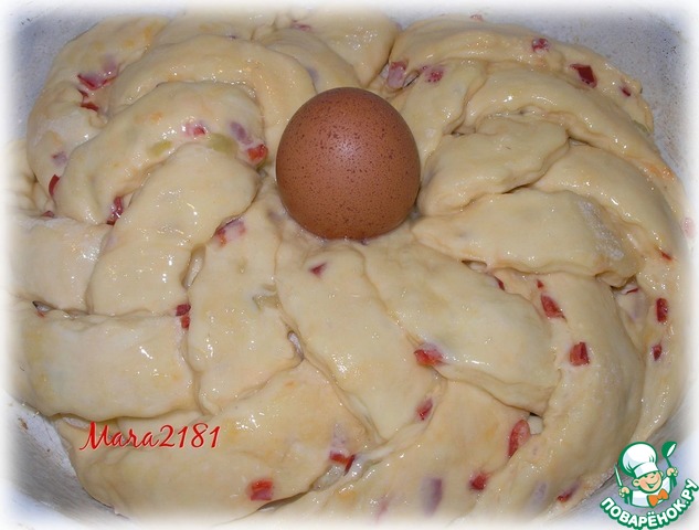 Подготовленное тесто необходимо соединить в круг, аккуратно переложить в подготовленную форму. Очень важно, чтобы место соединения не было заметно. При необходимости подправить полоски. Само тесто смазать взбитым яйцом, а в центр установать сваренное вкрутую яйцо (на яйце не должно быть трещин). Оставляю подходить тесто на минут 30.