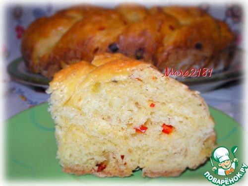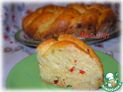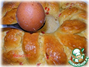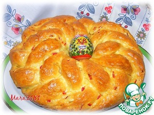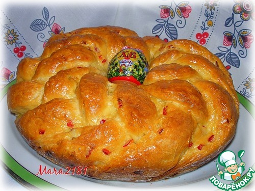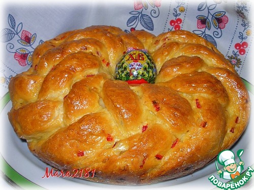 Мой праздничный каравай к Светлому Дню Великой Пасхи будет прекрасным украшением любого стола. Оригинален он тем, что в белый пшеничный хлеб я добавляю сладкий болгарский перец, маринованный солёный огурец и тимьян. Символичным украшением для такого каравая выступает расположенное в центре Пасхальное яйцо. Пикантный, ароматный, нежный, воздушный, слегка сладковатый хлебушек со светло-золотистой корочкой привлекателен не только своей внешней формой, но и в разрезе. Угощайтесь на доброе здоровье!