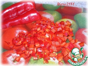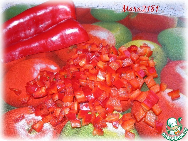 Промыть, обсушить 2 красных болгарских перца (общий вес 125 г) и нарезать мелкими кубиками.