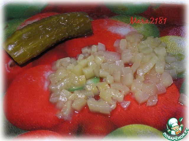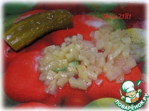 Маринованный огурец (весом 60 г) очистить от кожуры и тоже нарезать мелкими кубиками.