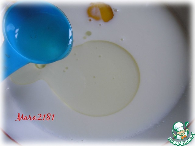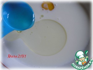 В тёплое молоко добавляю 1 яйцо, 2 ст. л. растительного масла и тщательно перемешиваю.