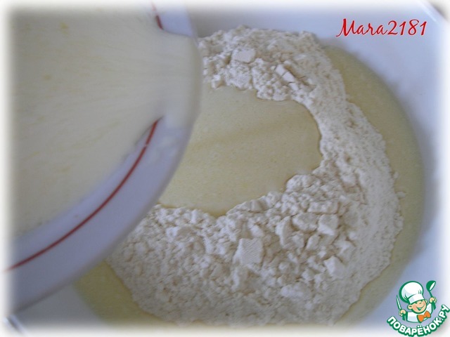 Теперь необходимо соединить молочно-яичную смесь с мучной смесью. Аккуратно начинаю замешивать тесто.