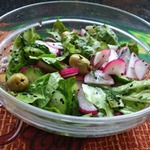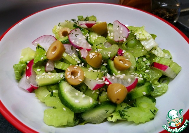Огурец нарезать тонкими колечками, сельдерей небольшими кубиками. Добавить оливки.
