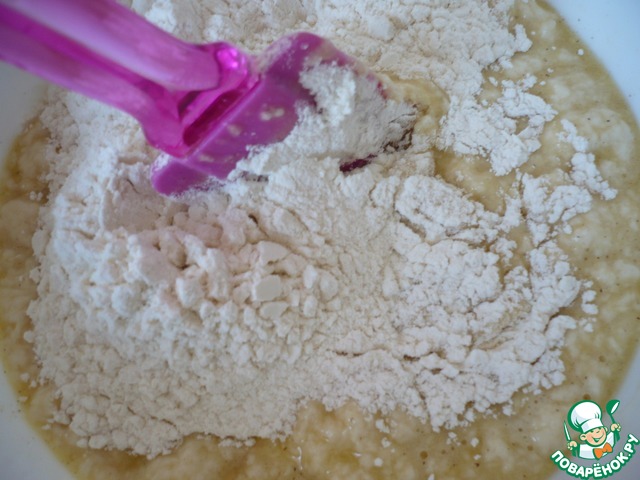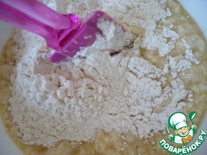 Добавить в эту смесь муку (сразу всю муку высыпать не нужно, смотрите по консистенции теста). Тесто замешиваем лопаточкой, пока это возможно.
