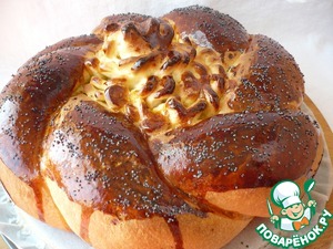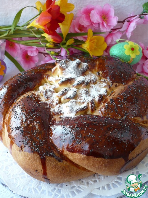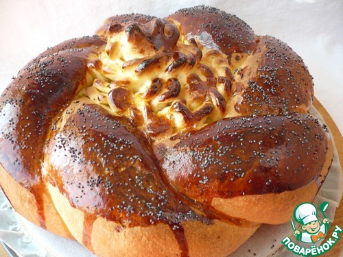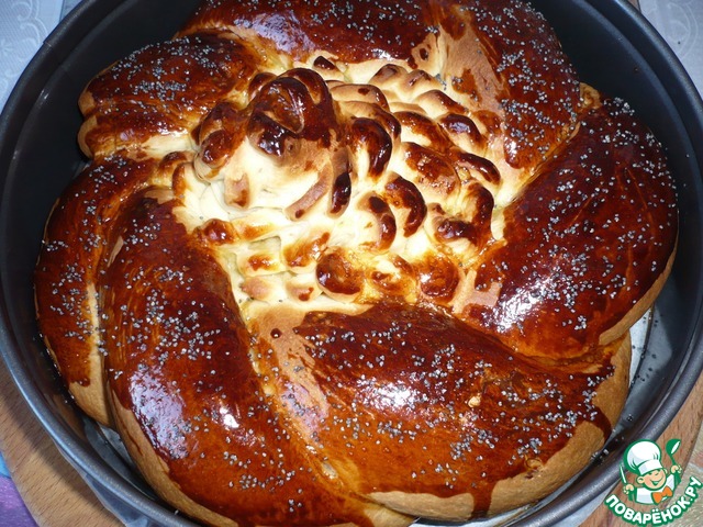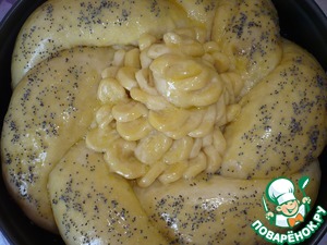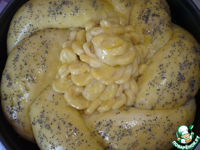 Пока смазка не подсохла посыпаем калач маком, только плетенку, а середину оставляем не посыпанной.