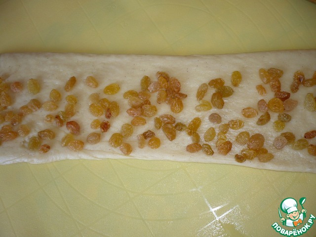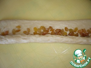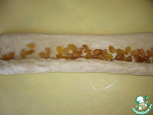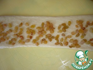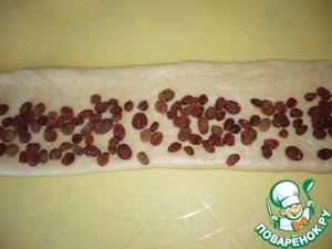 На раскатанную полоску теста выложить белый изюм. Расположить изюм ближе к одному краю.