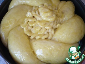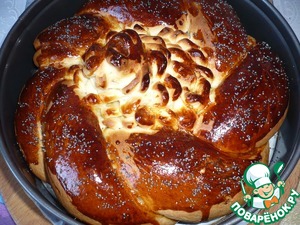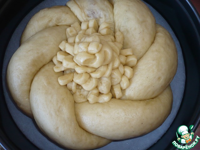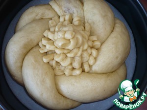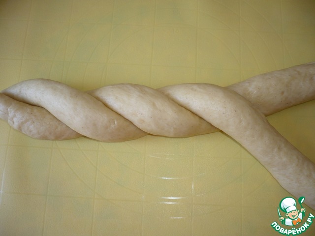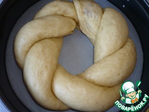 Выкладываем косичку в приготовленную форму, отступая немного от краев формы. Один край косички хорошо скрепляем, а другой край наоборот разъединить и затем аккуратно скрепляем два конца калача.