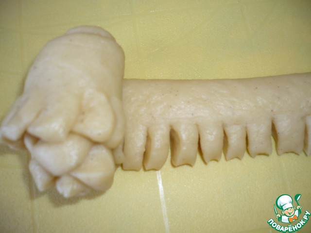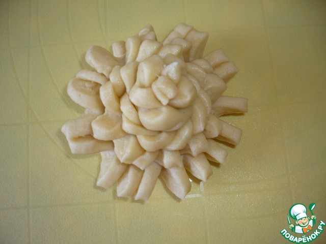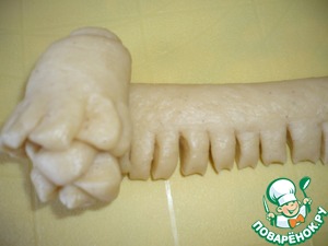 Берем маленький кусочек теста и из него делаем шишку. Тесто раскатать в длинный жгутик и немного прижать пальцами и начинаем нарезать ножом тесто до середины жгута, одновременно закручивая жгут.