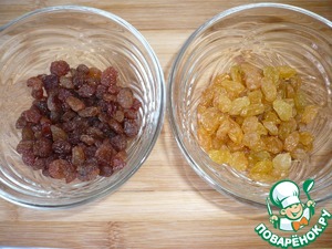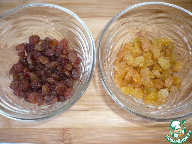 Подготовить белый и темный изюм: промыть и высушить на бумажном полотенце.