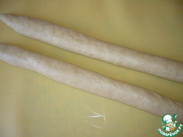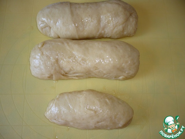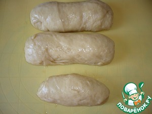 Не обминая тесто, отрезать кусок весом 150 г. Остальное тесто разделить пополам и каждому куску придать форму овального батончика. Тесто смазать растительным маслом и накрыть пищевой пленкой, оставить на 5-7 минут.