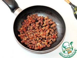 1. Изюм залить горячей водой, через 5 минут воду слить, изюм промыть. Выложить изюм на сухую сковороду и обсушить.