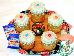 Смазываем остывшие куличи глазурью и посыпаем сразу посыпкой, т. к. глазурь быстро подсыхает.