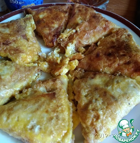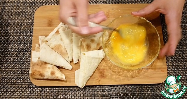 Обмакните каждый треугольник в яйцо и выложите на сковороду.