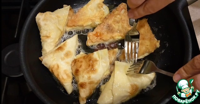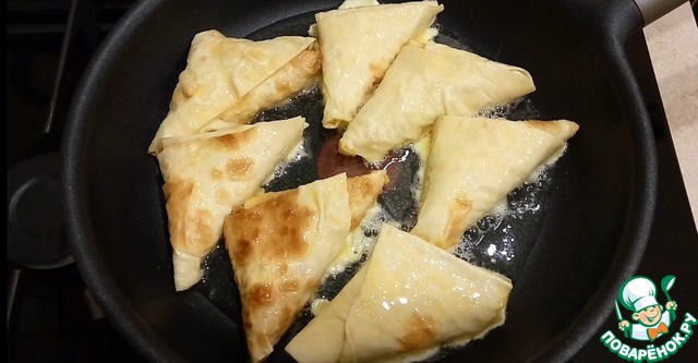 Жарьте треугольнички из лаваша с двух сторон до золотистого цвета.