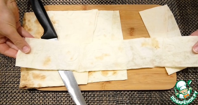 Разрежьте лаваш на полоски длиной 20-25 см, а шириной 5-6 см. У меня из одного лаваша получилось 7 полосок.