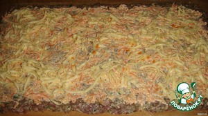 Морковь натрите на терке и смешайте со сметаной, готовую смесь выложите на фарш тонким слоем
