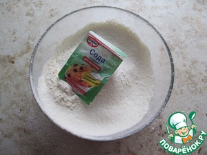 Пшеничную муку просеять с пищевой содой. Количество муки приведено примерное, возможно добавление некоторого количества до получения теста нужной консистенции!