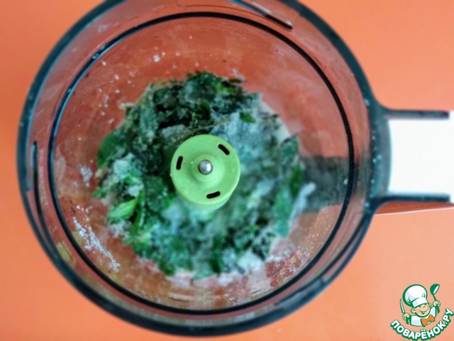 В блендер поместить чистые, сухие листья мяты (можно использовать сушёную мяту 2-3 ч. л) и сахар. Измельчить.