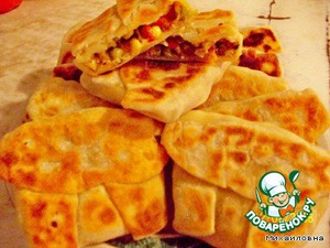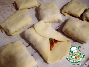 Из 400 г муки, соли, 100 г маргарина и 1 ст.тёплой воды замесить тесто. Сформовать 12 шариков величиной с яйцо и оставить на 15 мин. Затем раскатать в кружки величиной с блюдце, выложить начинку и защипать конвертиками.