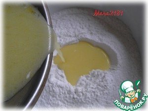 А в это время в тёплую сыворотку добавить 50 г сахара, 0,5 ч. л. соли, 2 яйца и 2 ст. л. растительного масла. Всё тщательно перемешать до однородности.